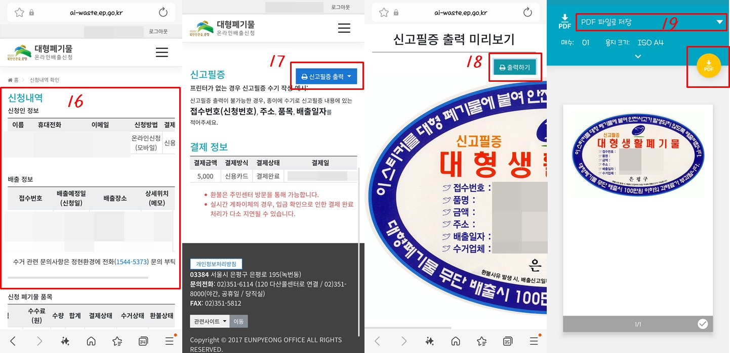프린트기가 없는 경우 : 빈 종이에 수기로 신고필증 내용에 있는 접수번호(신청번호), 주소, 품목, 배출일자를 적어주세요.