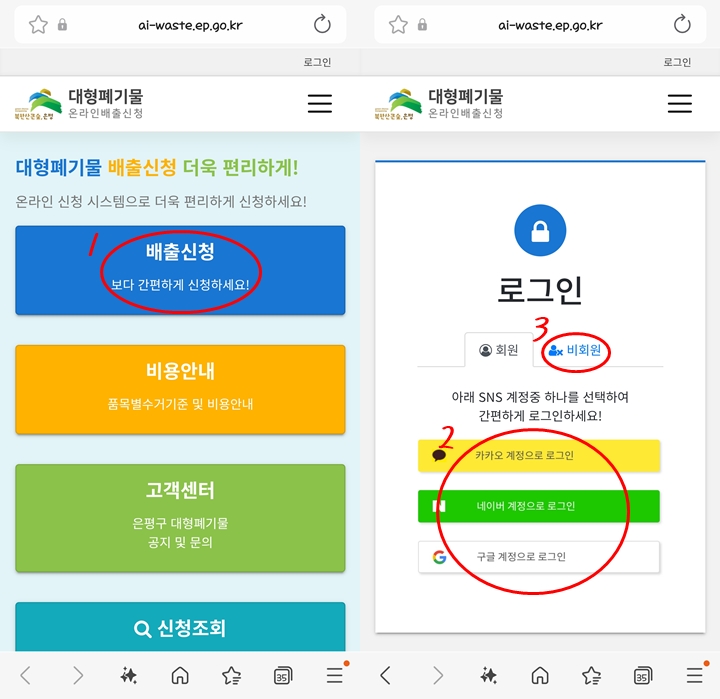 1. 배출신청을 누르면 로그인 화면이 뜹니다.